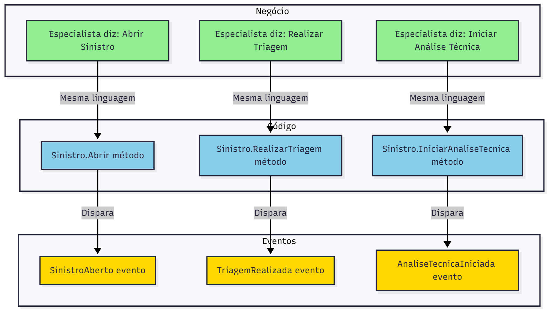 Fluxo mostrando como termos do negócio (verde) mapeiam diretamente para código (azul) e eventos (amarelo)