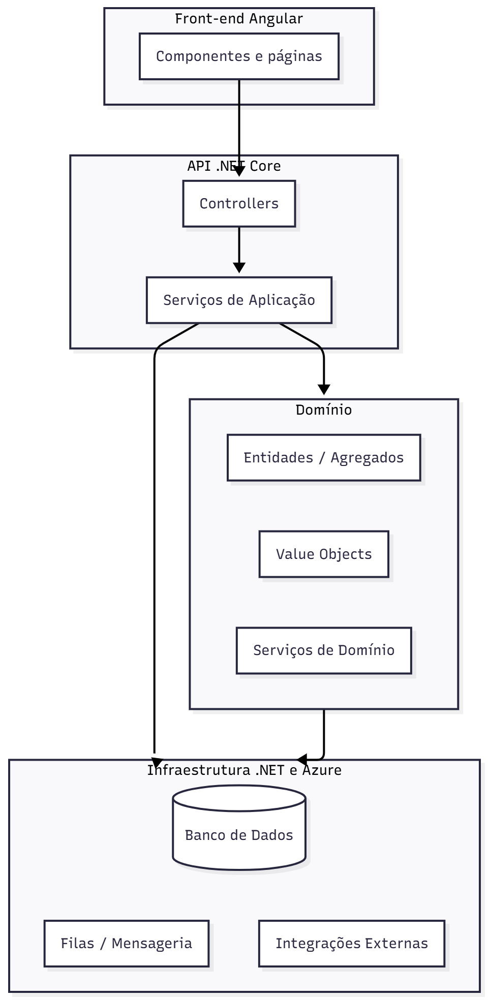 O Angular fala com a API, que orquestra casos de uso na camada de aplicação. A lógica de negócio mora no domínio. Infraestrutura faz o trabalho “sujo” (banco, filas, integrações).