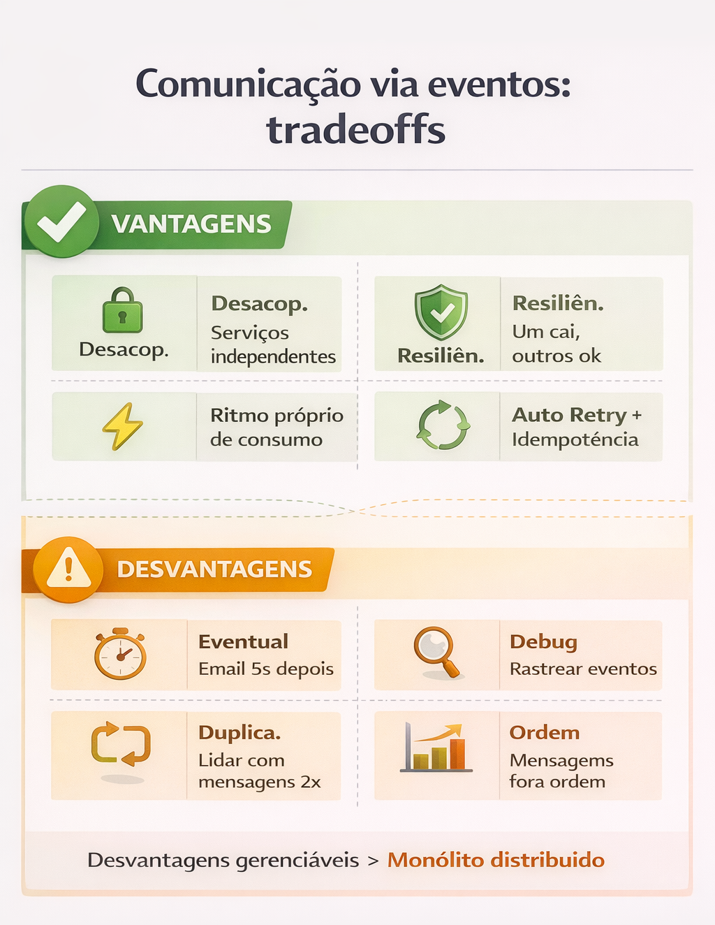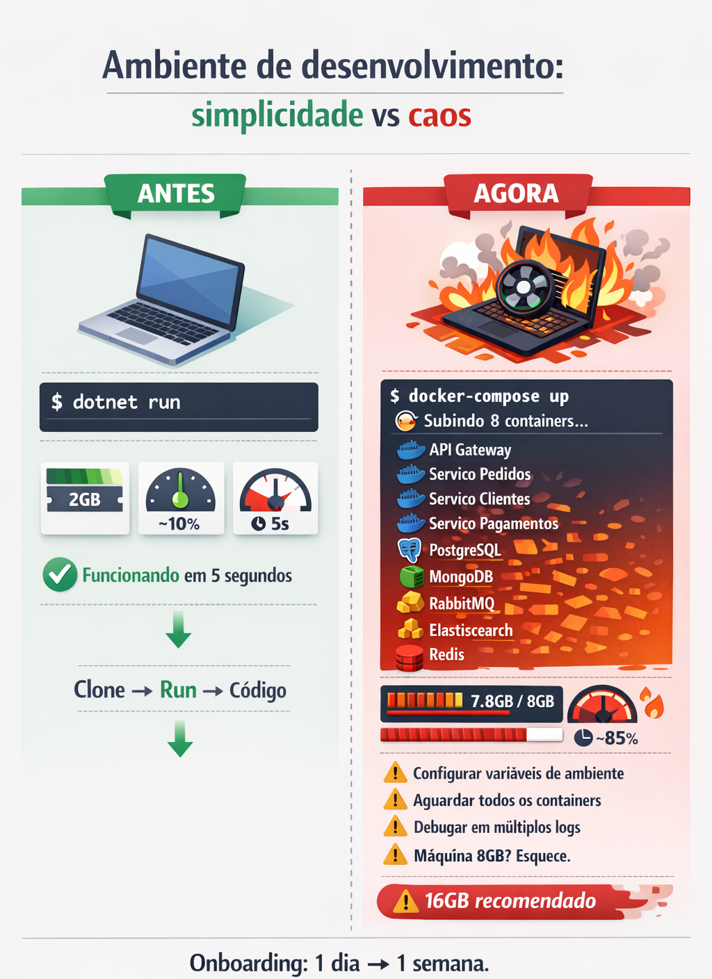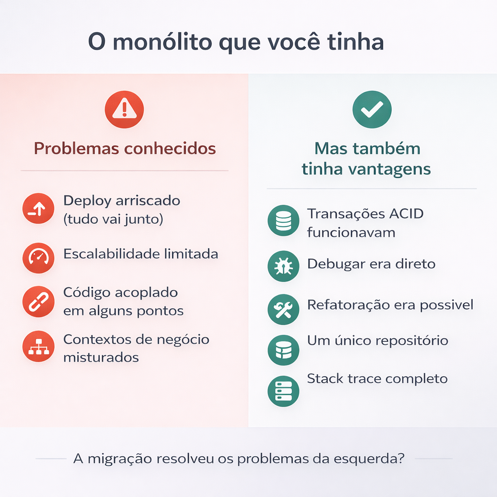 O resultado foi um monólito distribuído — todas as desvantagens de um monólito, somadas à complexidade de sistemas distribuídos.