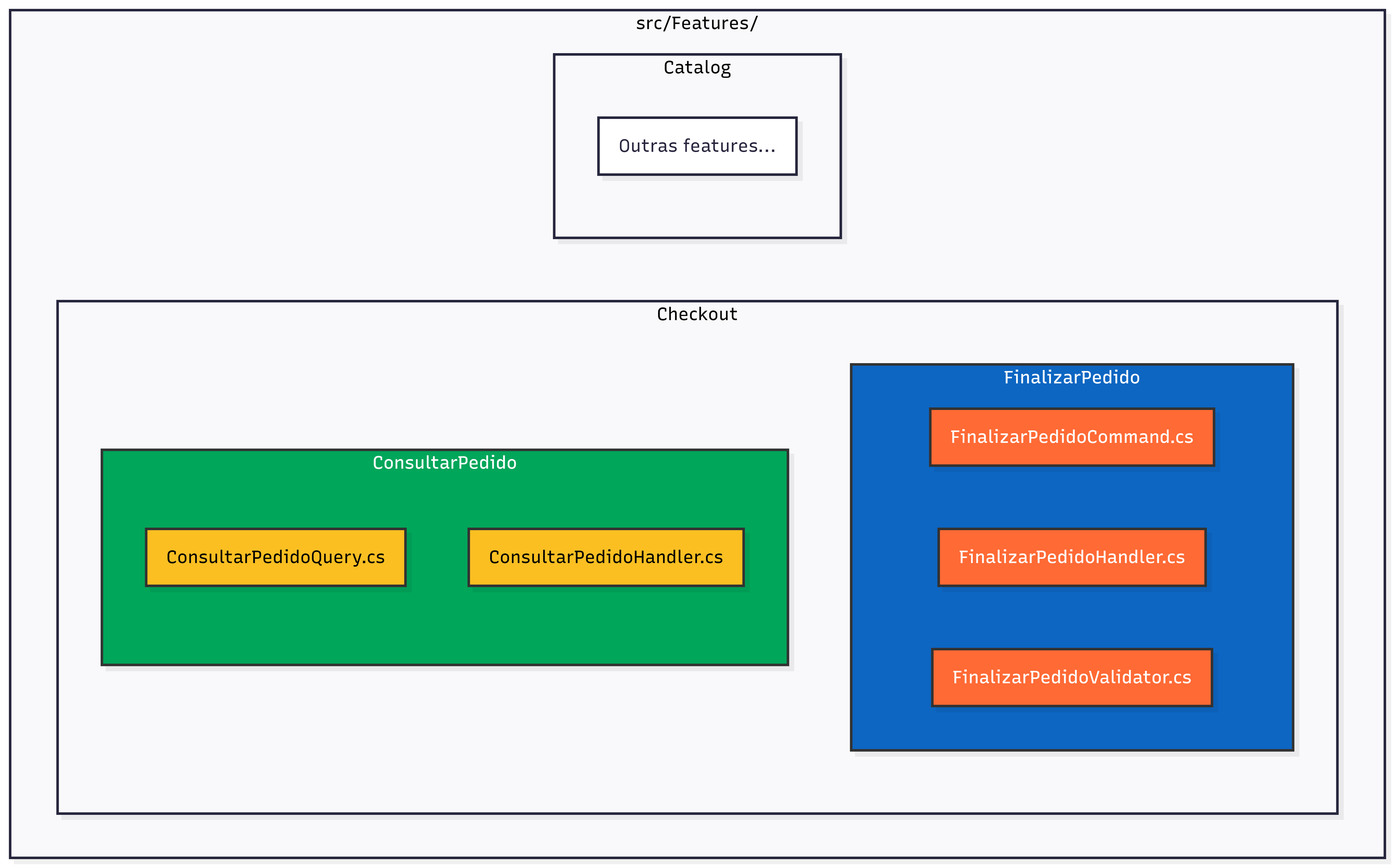 Arquitetura de fatias verticais (Vertical Slice Architecture) + CQRS seletivo.